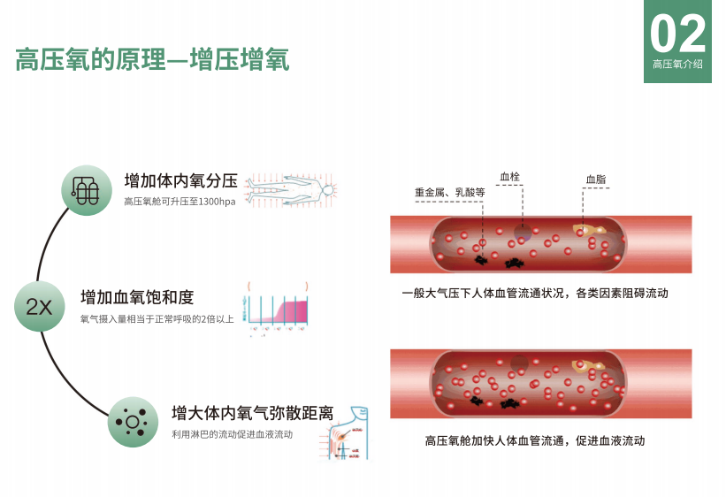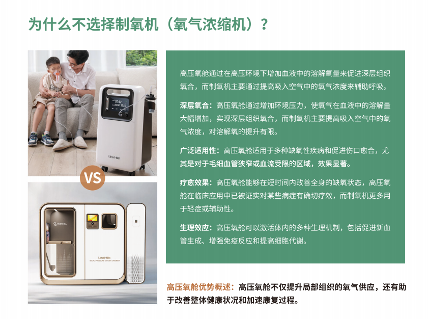 微高壓氧艙(1.3-1.5倍大氣壓)通過加壓環境顯著提升血氧溶解量,促進細胞修復、緩解炎癥,適用于亞健康調理及運動恢復;制氧機僅常壓補氧,吸收效率低,主要滿足日常基礎需求,無法實現高壓下的深度氧療效果。